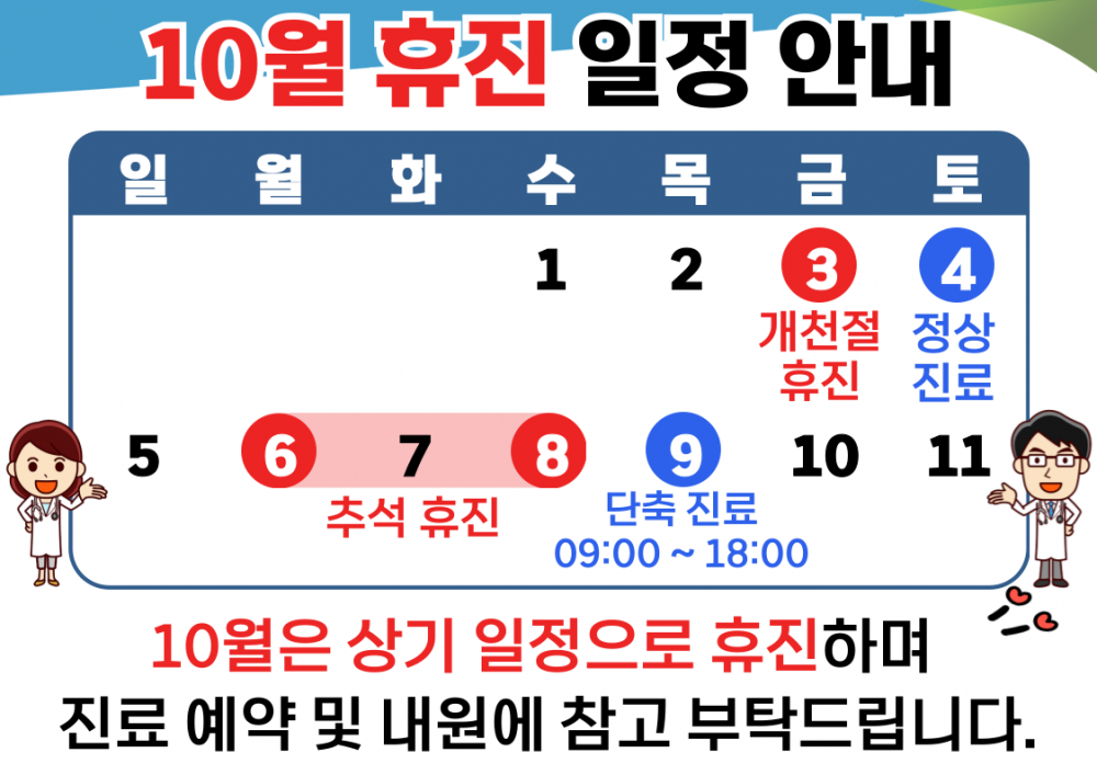 인쇄 스크랩 목록 10월 휴진 일정 안내드립니다. 페이지 정보 연세Y재활의학과 871 0 2025-06-11 14:00:47 본문 안녕하세요. 연세와이재활의학과입니다.10월은 상기 일정으로 휴진하며 진료 예약 및 내원에 참고 부탁드립니다. 인쇄 스크랩 목록 이전글 ▲2025 광주하남 '더(+, The) 미담' 메디컬 공유학교 프로그램 진행! 다음글 ▼연세Y재활의학과 - 광주하남교육지원청 - 굿네이버스와 아동 건강지원 협약식 진행! 댓글목록 등록된 댓글이 없습니다. 이전글 다음글 목록